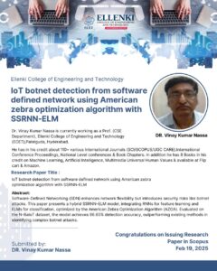 One of his most recent and groundbreaking research papers, “IoT Botnet Detection from Software Defined Network Using American Zebra Optimization Algorithm with SSRNN‑ELM,” introduces an innovative AI-driven approach to counter cyber threats in Software-Defined Networking (SDN). By integrating Recurrent Neural Networks (RNNs), Extreme Learning Machines (ELMs), and the American Zebra Optimization Algorithm (AZOA), this study significantly enhances the detection of botnet attacks, achieving an impressive 96.60% accuracy. His work provides a strong foundation for improving IoT security and mitigating cyber risks in evolving network architectures.