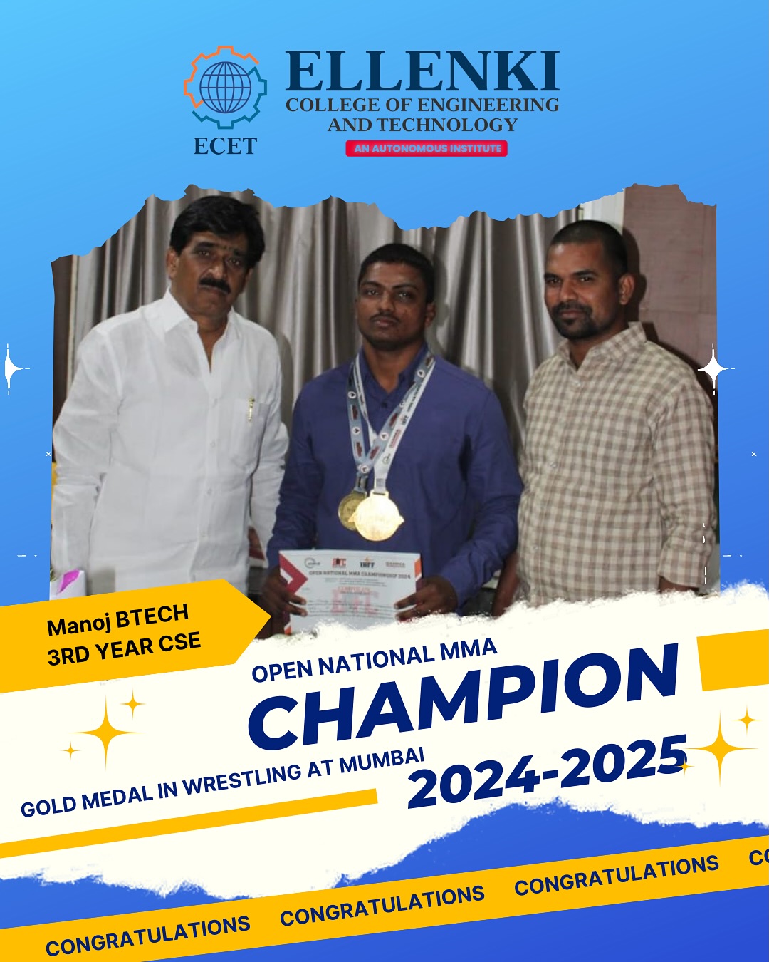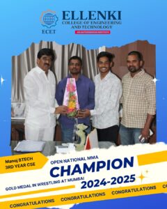Ellenki College takes immense pride in celebrating the remarkable achievements of our students in the world of sports! Manoj, a BTech CSE III Year student, has brought home a prestigious Gold Medal in Wrestling at the Open National MMA Championship held in Mumbai. His dedication, discipline, and relentless training have made him a true champion, proving that hard work and perseverance always lead to success. Manoj’s victory not only brings honor to Ellenki but also serves as an inspiration to aspiring athletes within our college.