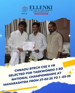 Adding to our streak of excellence, Chandu, a BTech CSE II Year student, has been selected to compete in the 3rd National Taekwondo Championship in Maharashtra from February 27 to March 1, 2025. This prestigious event will bring together some of the best Taekwondo talents in the country, and we are confident that Chandu will make Ellenki proud with his strength, skill, and determination. His selection at the national level is a testament to our students’ dedication to both academics and sports, proving that Ellenki fosters all-round excellence.