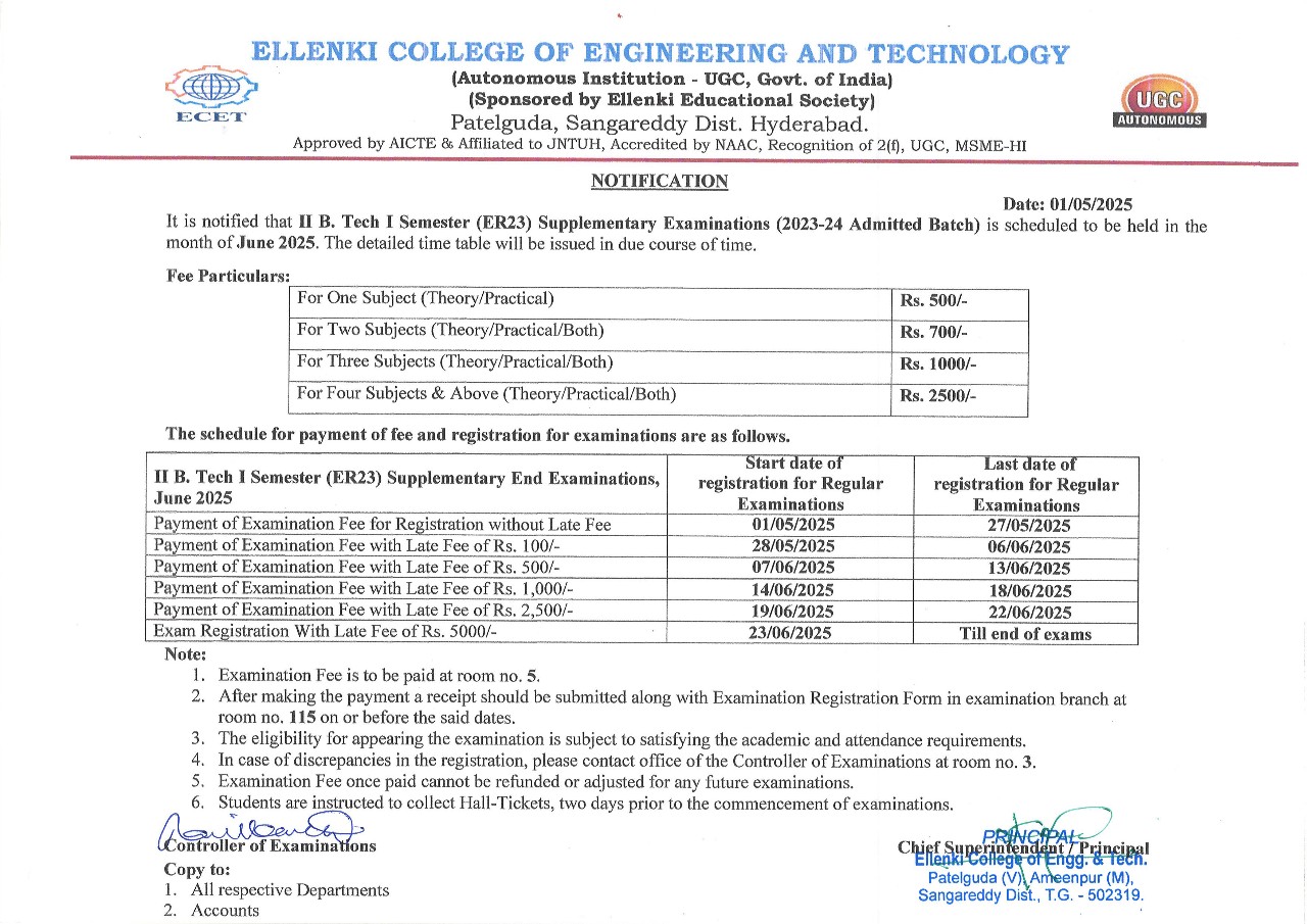 II B. Tech I Semester Supplementary Exam Notification..2024 Batch